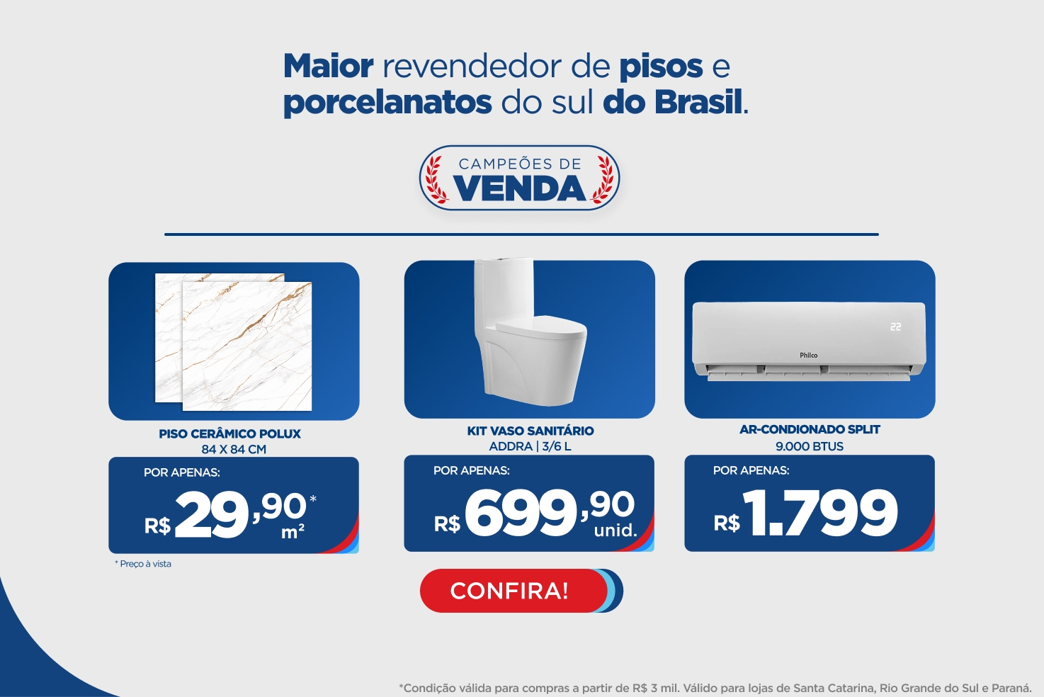 Em nosso site, você encontra pisos, revestimentos, tintas, materiais hidráulicos, elétricos e muito mais, com a confiança de uma marca que prioriza excelência e durabilidade.