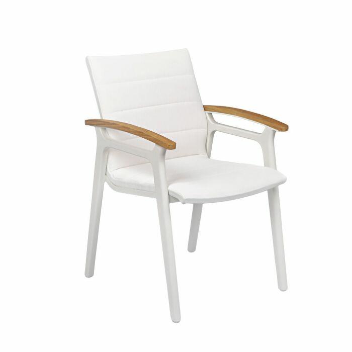 Fabricada em alumínio off white com textilene acolchoado, a cadeira garante durabilidade e conforto. Os braços em madeira teca adicionam um toque natural e elegante, enquanto os pés slim conferem leveza ao design.
