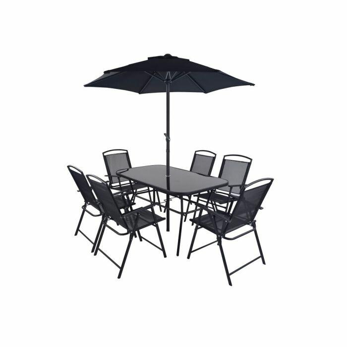 Um conjunto de móveis de jardim projetado para criar um espaço confortável ao ar livre. É composto por oito peças: 1 mesa retangular, 6 cadeiras e 1 ombrelone. A mesa tem um design prático e funcional. As seis cadeiras possuem um assento e encosto confortáveis, revestidos em tecido de textilene. O conjunto é perfeito para reunir familiares e amigos e desfrutar de momentos relaxantes em seu jardim, pátio ou área externa coberta.