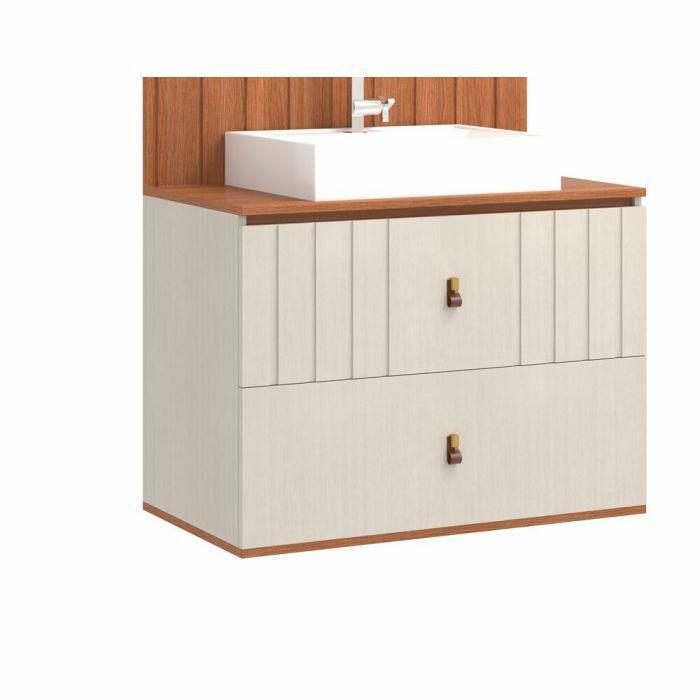 O móvel conta com 1 porta e 1 gaveta, oferecendo espaço ideal para armazenar itens de higiene e acessórios do dia a dia. A gaveta possui corrediças telescópicas, garantindo abertura suave, completa e durável. Os puxadores em couro sintético acrescentam um toque moderno e sofisticado ao conjunto.