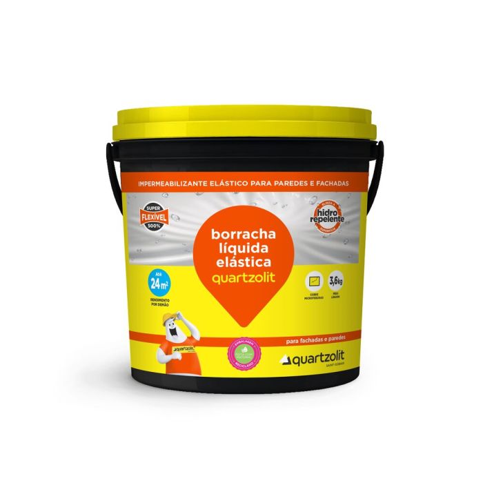 | Informações Adicionais | A borracha líquida elástica quartzolit é uma pintura impermeabilizante de altaperformance e com alta elasticidade (500%), ideal para a revitalização eimpermeabilização de fachadas e paredes. Possui um excelente acabamento e coberturaalém de ter ação hidrofugante, “efeito gota”, blindando a superfície contra os efeitos daumidade. 1. INDICAÇÕES • Fachadas • Revitalização de fachadas (pintura sobre textura, grafiatos, tintas etc); • Revestimentos verticais (cerâmicas e porcelanatos) desde que aplicado o primer flexquartzolit; • Paredes internas e externas; • Telhas de fibrocimento; • Telhas cerâmicas; • Telhas metálicas; • Lajes sem trânsito; • Drywall. |